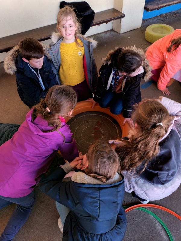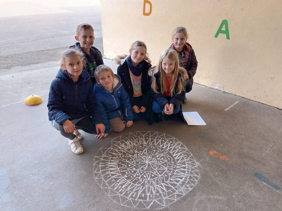 Jeudi avec Jeanne et les CE1, nous avons finalisé notre projet sur l’Inde en réalisant des mandalas à la craie sur la cour des maternelles. Vendredi (aujourd’hui), nos filleuls des PS et MS les ont sublimés en y ajoutant les couleurs. Voici un aperçu, c’est superbe!!